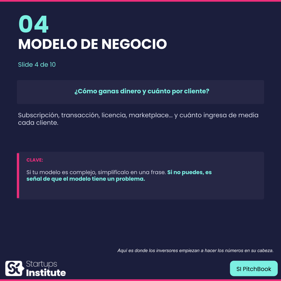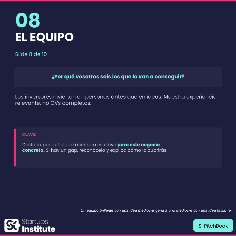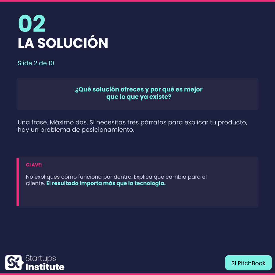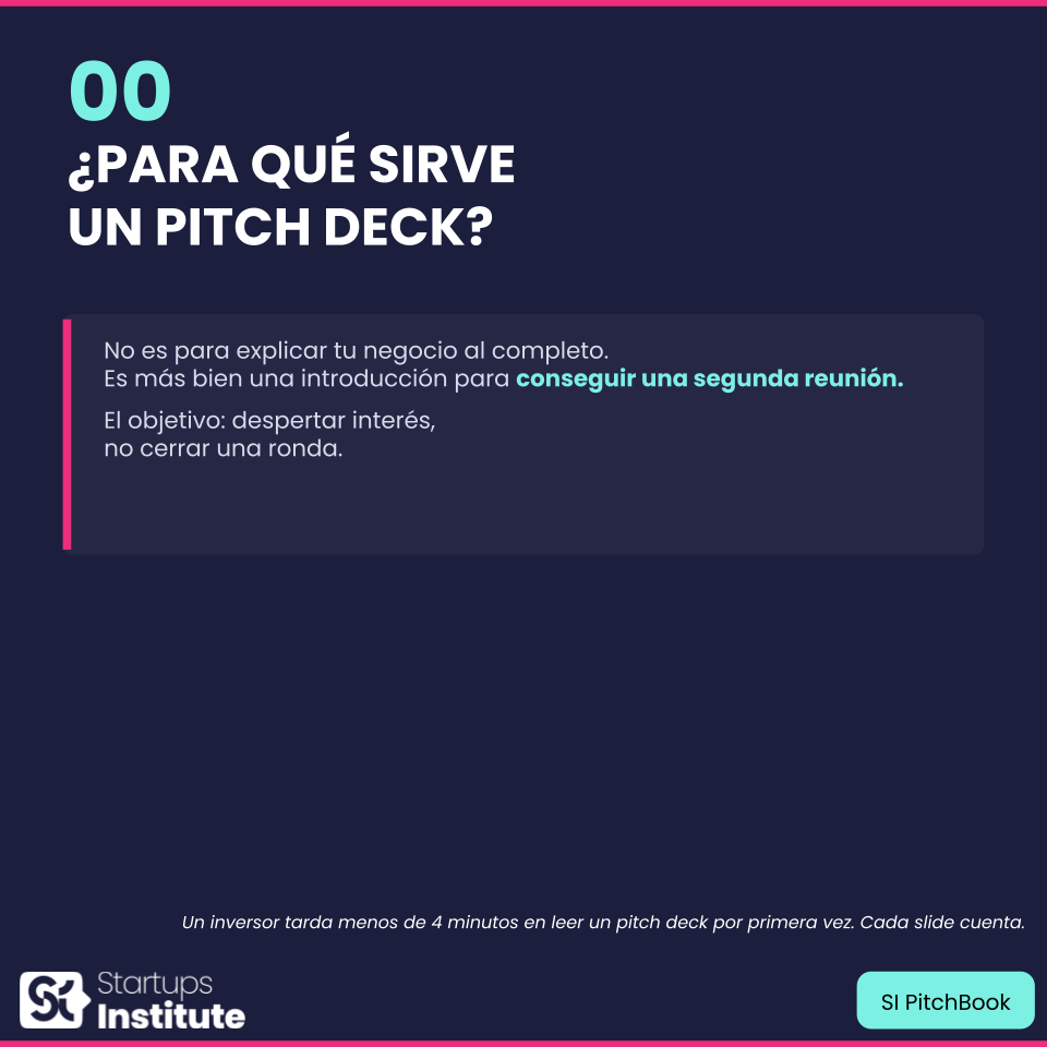 La misión del deck debe ser conseguirte una reunión, y es un modelo de presentación bastante estándar. Todo lo que se salga de los cánones habituales supone asumir riesgos innecesarios. Por eso en Startups Institute, después de revisar muchos modelos y de ver miles de decks hemos decidido hacer nuestro propio PitchBook condensando todo lo que sabe nuestro claustro sobre cómo construir el mejor pitch deck.